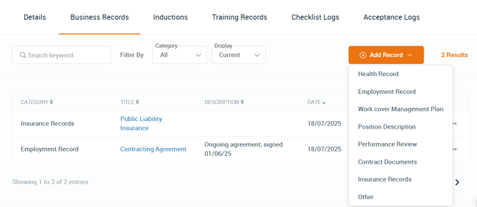 Use Business Records to add a range of information relating to Contractors connected through the Contractor Directory. These include employment documents, performance reviews, insurance records and more.