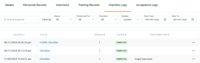 Checklists are guides to step workers through checks they must do before operating a machine or undertaking a task. Use a Checklist Log to see the status or a user's response.