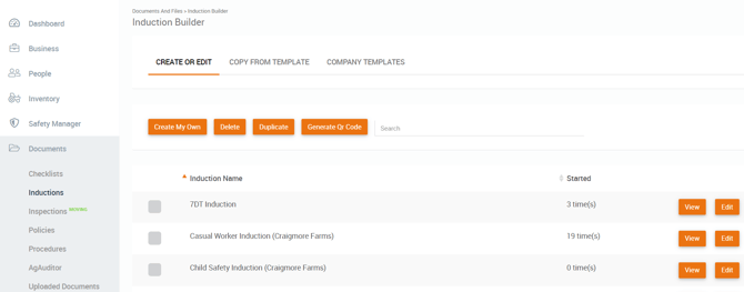 - Inductions can be created from a Safe Ag Systems template, or by creating your own.