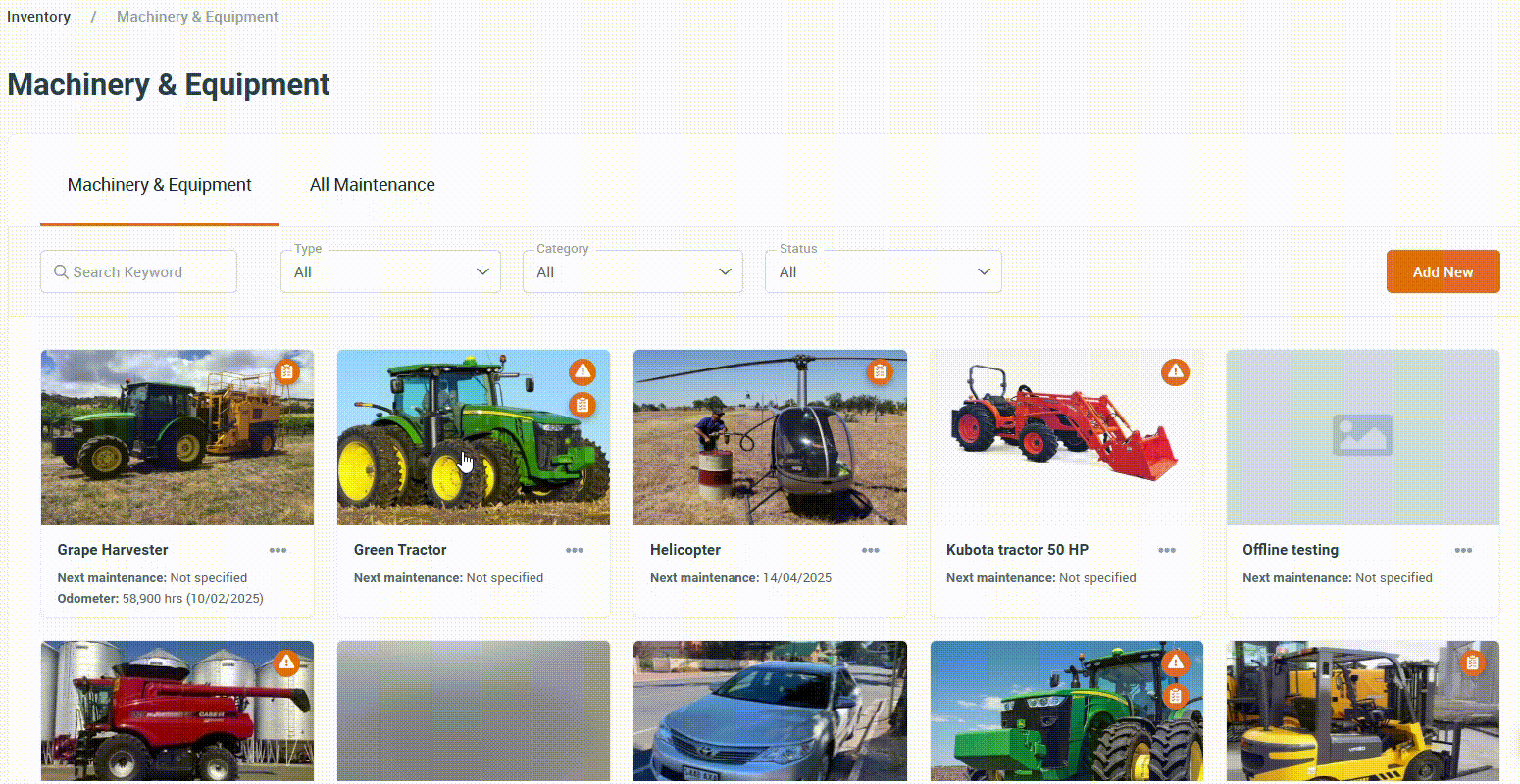 - From the left menu navigate to Inventory > Machinery & Equipment or Structures or Tools or Chemicals.